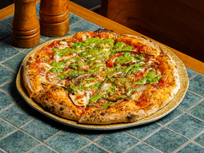 Tomato based, summer vegetable, mozzarella, pesto, grana padano